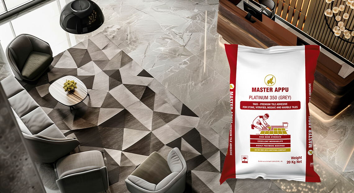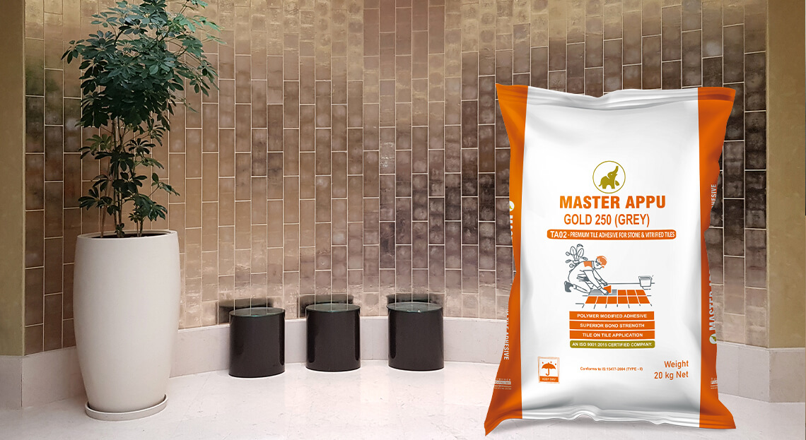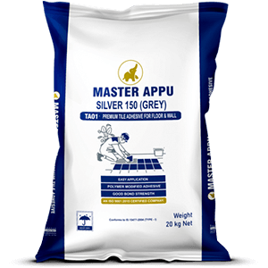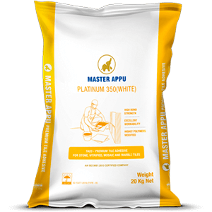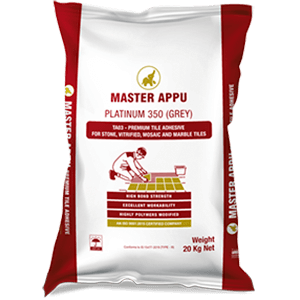 Mix Master Appu Tile Adhesive with approximately 5-6 litres of water for a 20 kg bag using a mechanical mixer for 3-5 mins until a homogeneous paste forms.